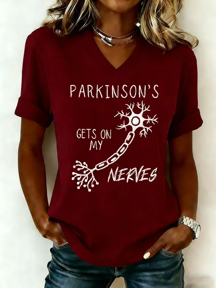 Cotton V-Neck T-Shirt Parkinson's Gets On My Nerves Graphic Tee for Women