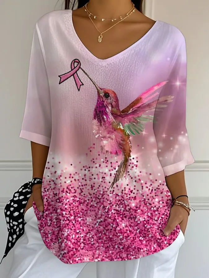 Women'S Casual Hummingbird Breast Cancer Meaning Bubble Wrinkle Top